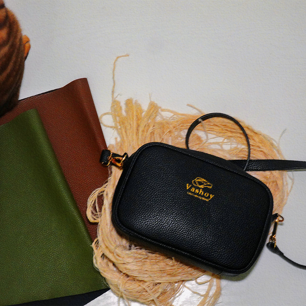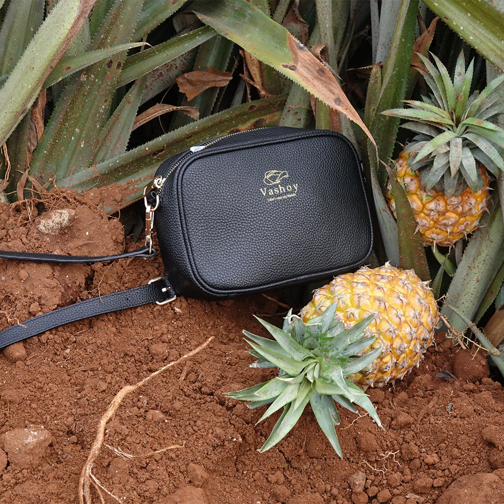 Looking for a stylish and sustainable vegan leather bag? This petite crossbody bag is meticulously fashioned from luxurious pineapple leather, offering a unique and eco-friendly alternative. It features a sleek black pebbled finish and elegant light gold links. Inside, you'll find a 100% recycled Nylon lining.